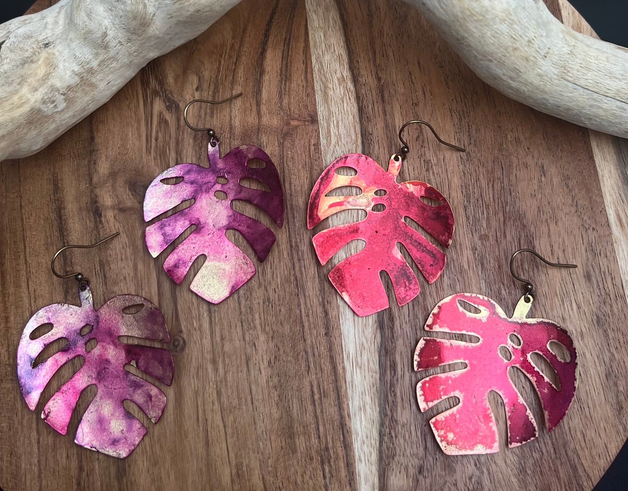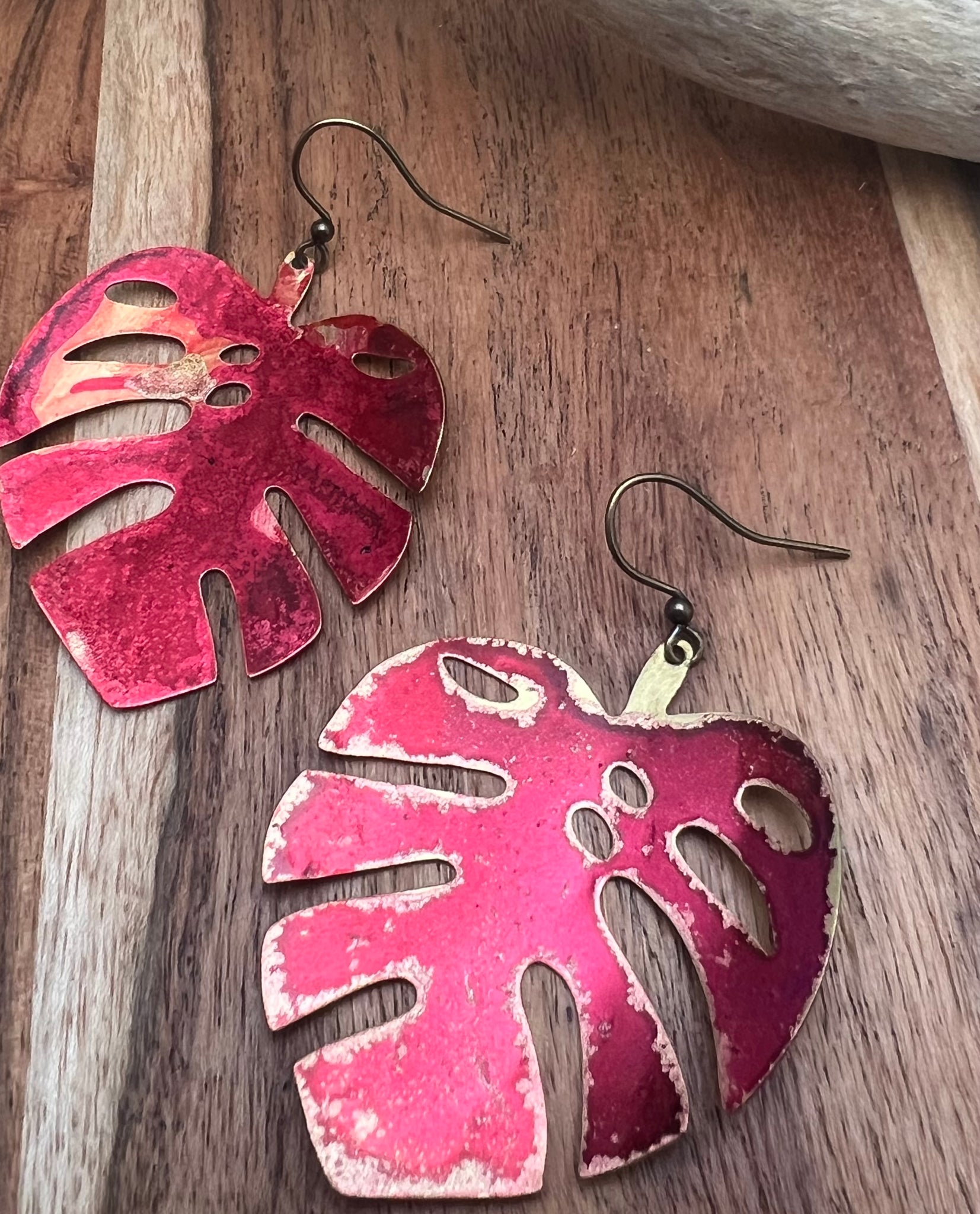 Hand painted large monstera earrings on antique brass ear hooks