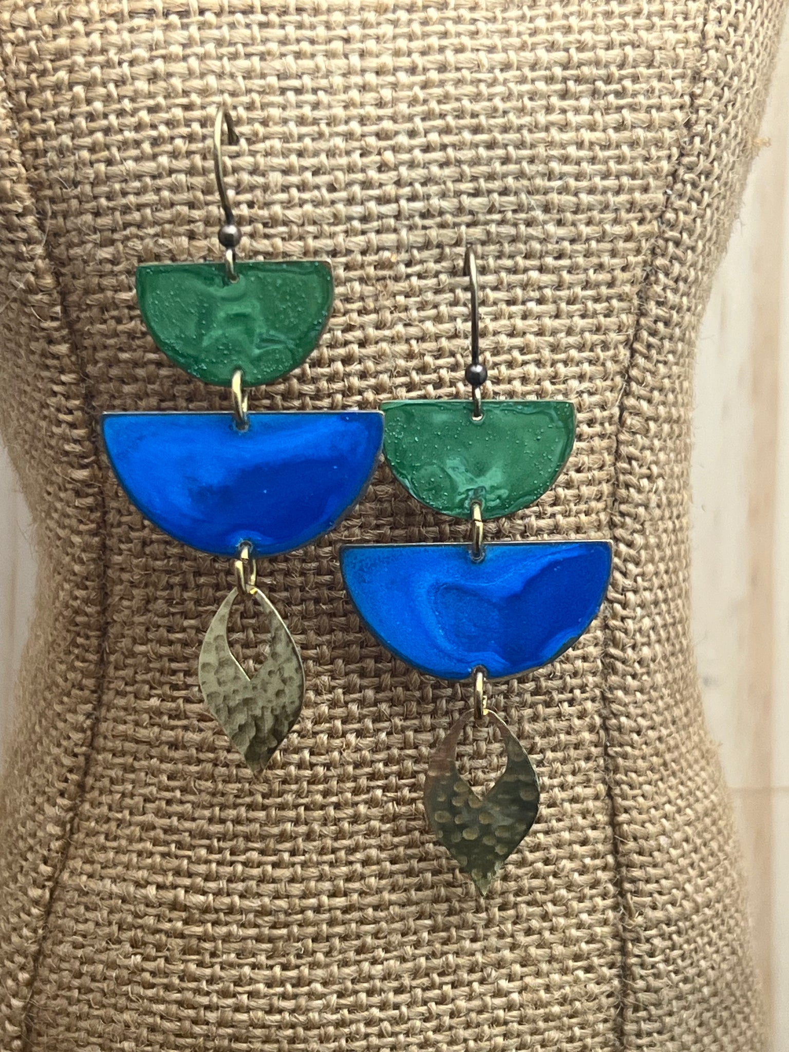 Sage green and cobalt blue patina earrings. 2 1/2 inches long on antique brass ear hooks.
